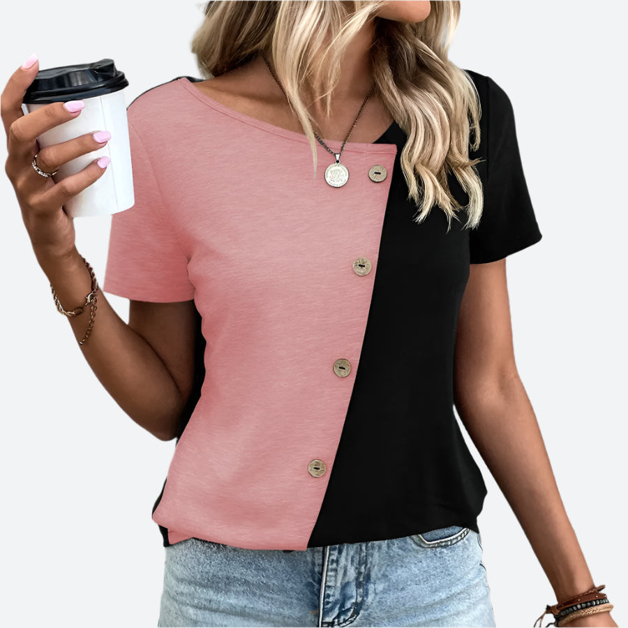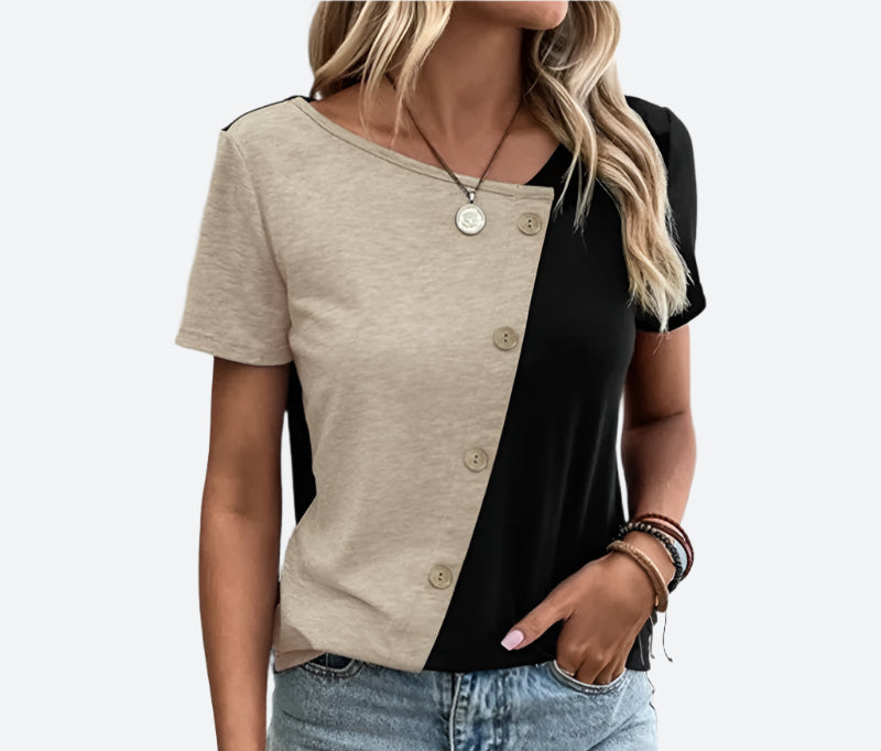 - Design/Feature: Asymmetrical Button Detail with Contrast Panel