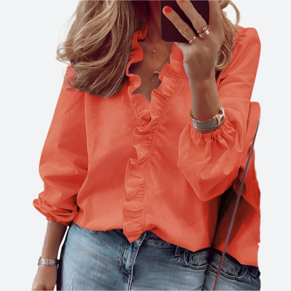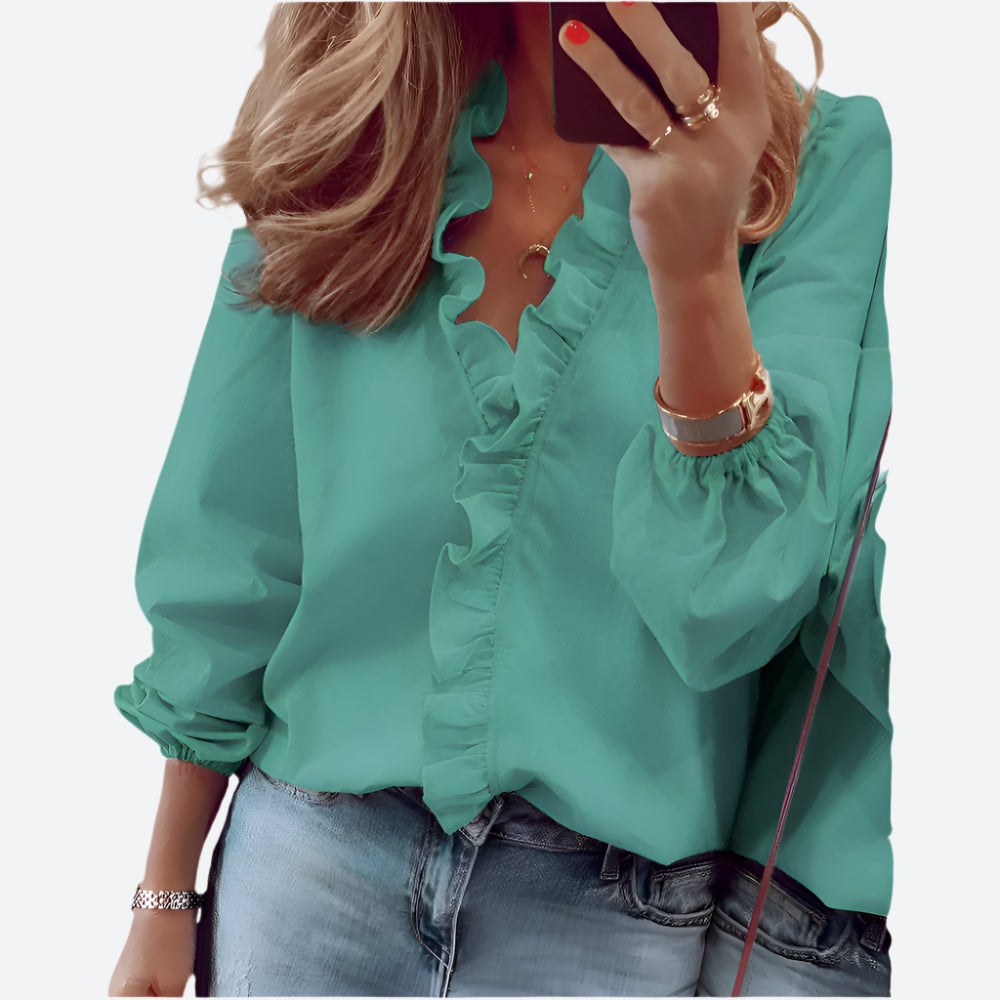 • Design/Feature: Elegant Ruffled V-Neckline and Cuffs