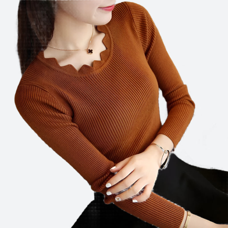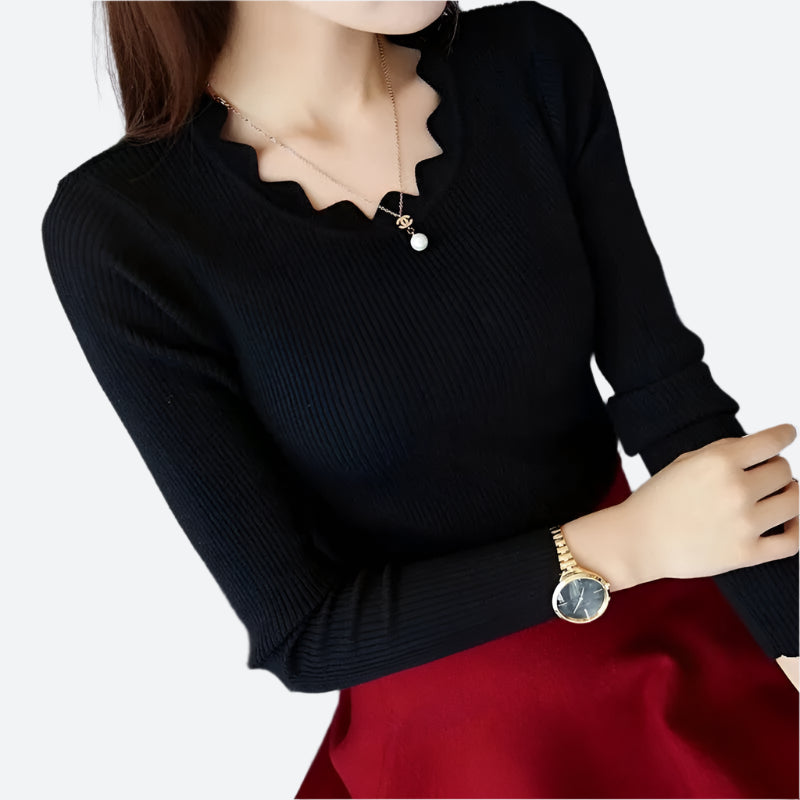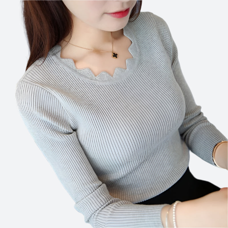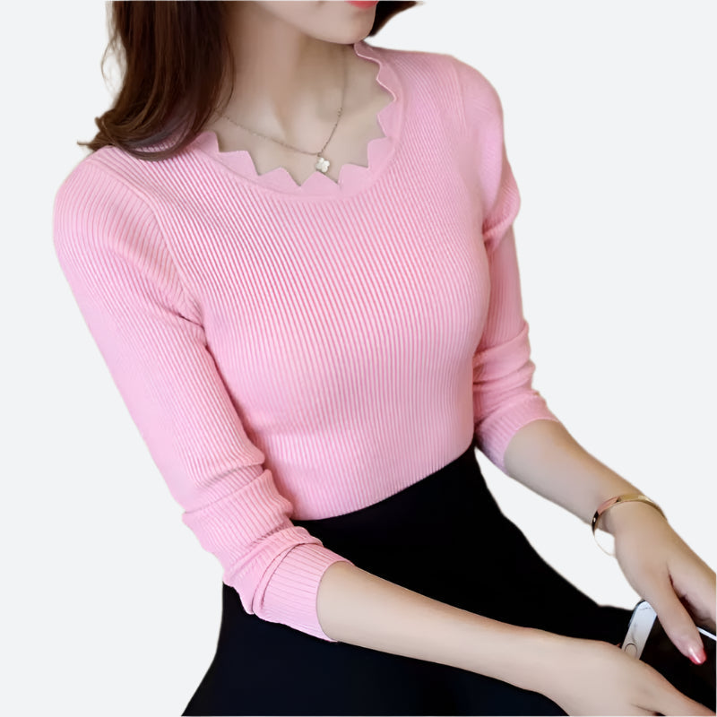 Scalloped Ribbed Long-Sleeve Knit Tops