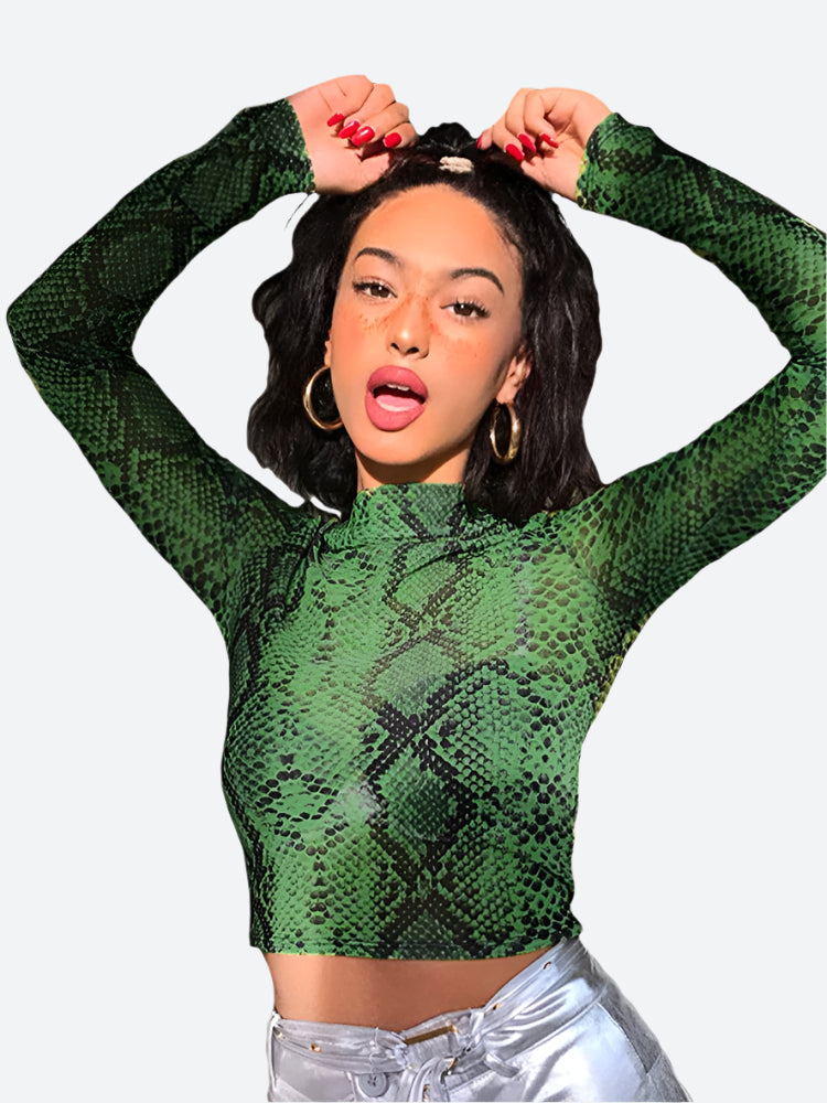 Snakeskin Print Long-Sleeve Crop Tops
