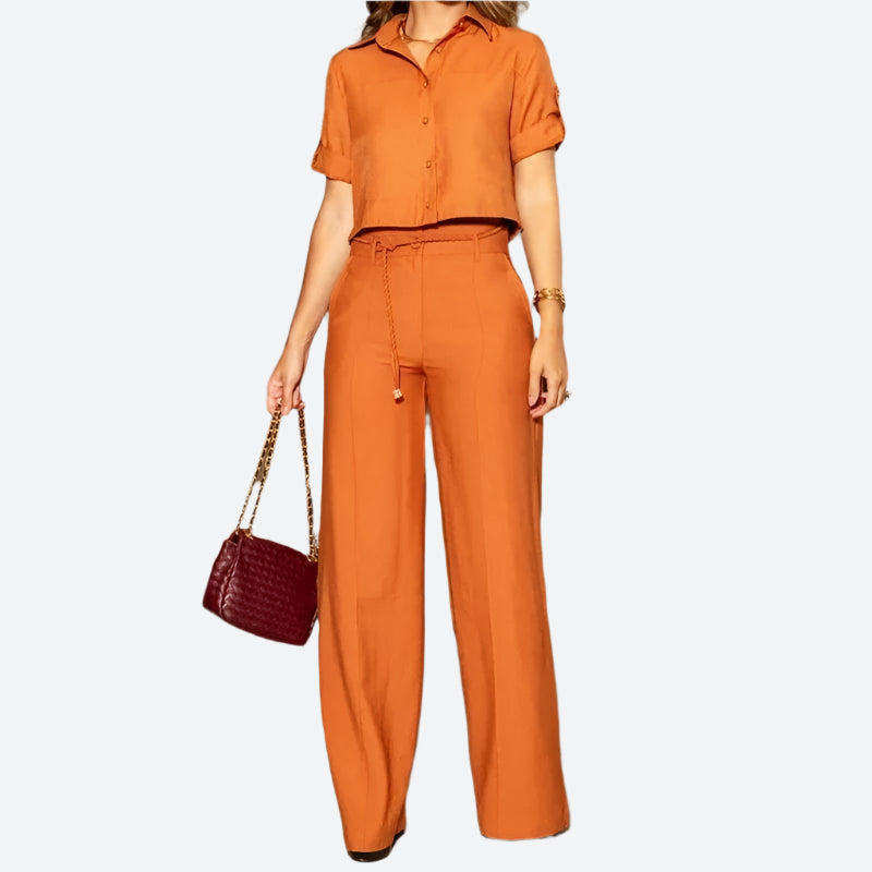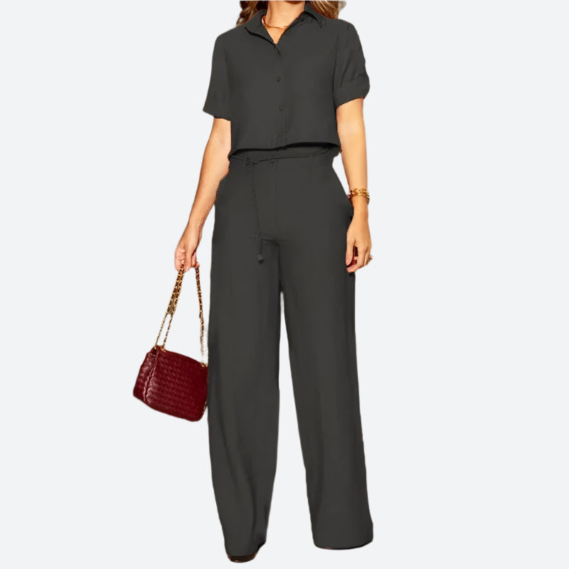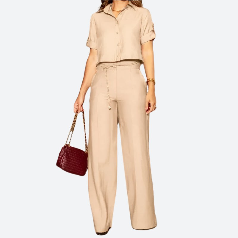 - Design/Feature: Chic button-up shirt with tie-waist pants